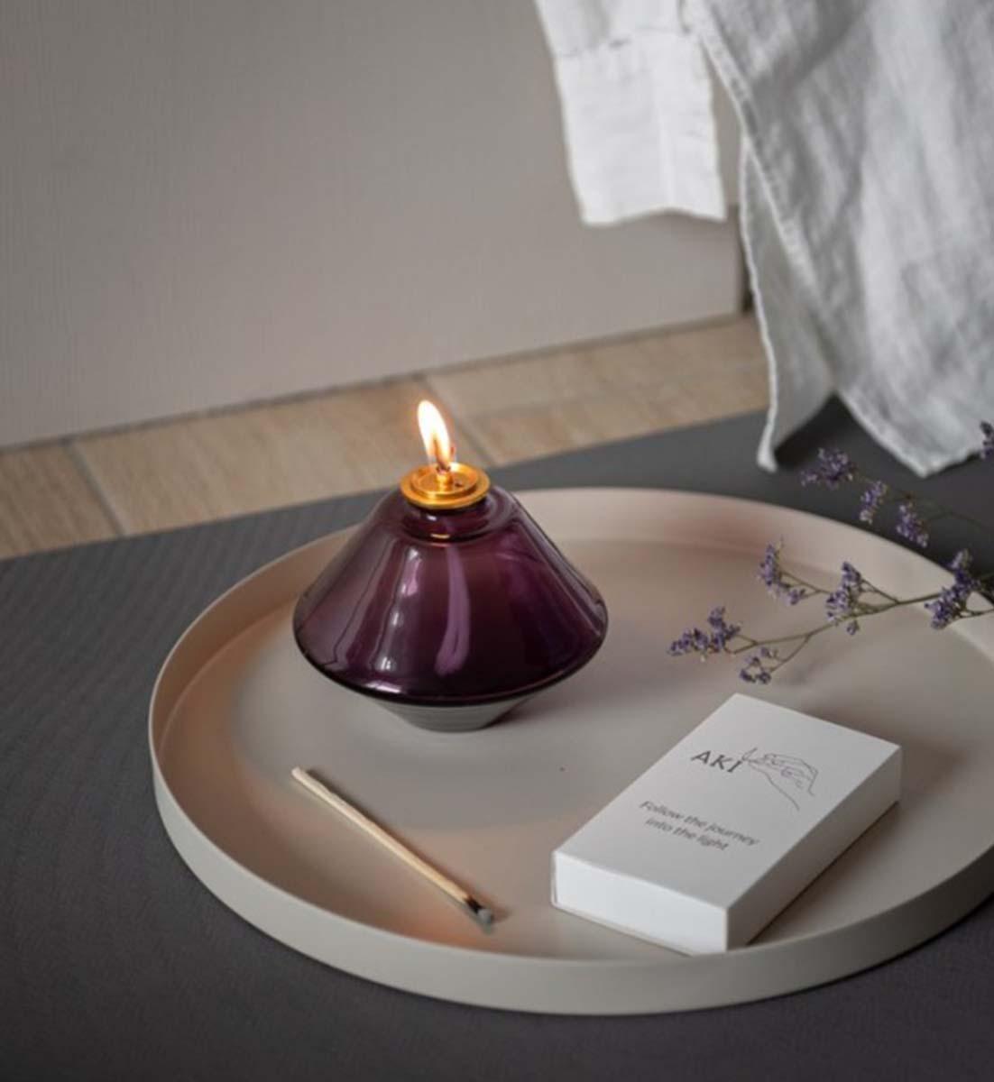 Diese gläserne Öllampe ist eine moderne Interpretation eines antiken Gefässes kombiniert mit einer modernen, geometrischen Form in reinen und schimmernden Farben.