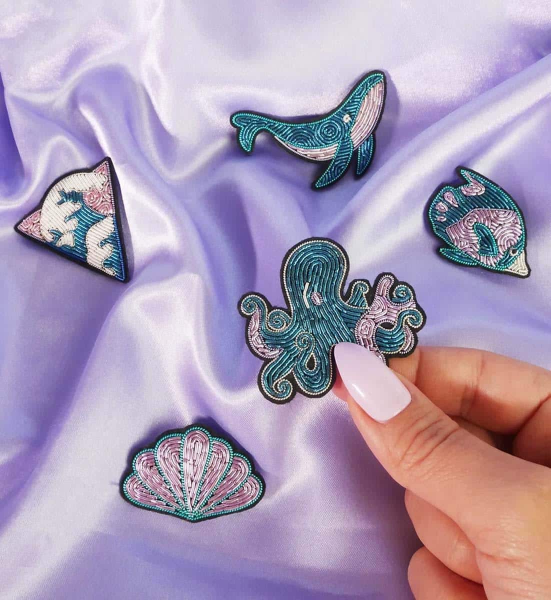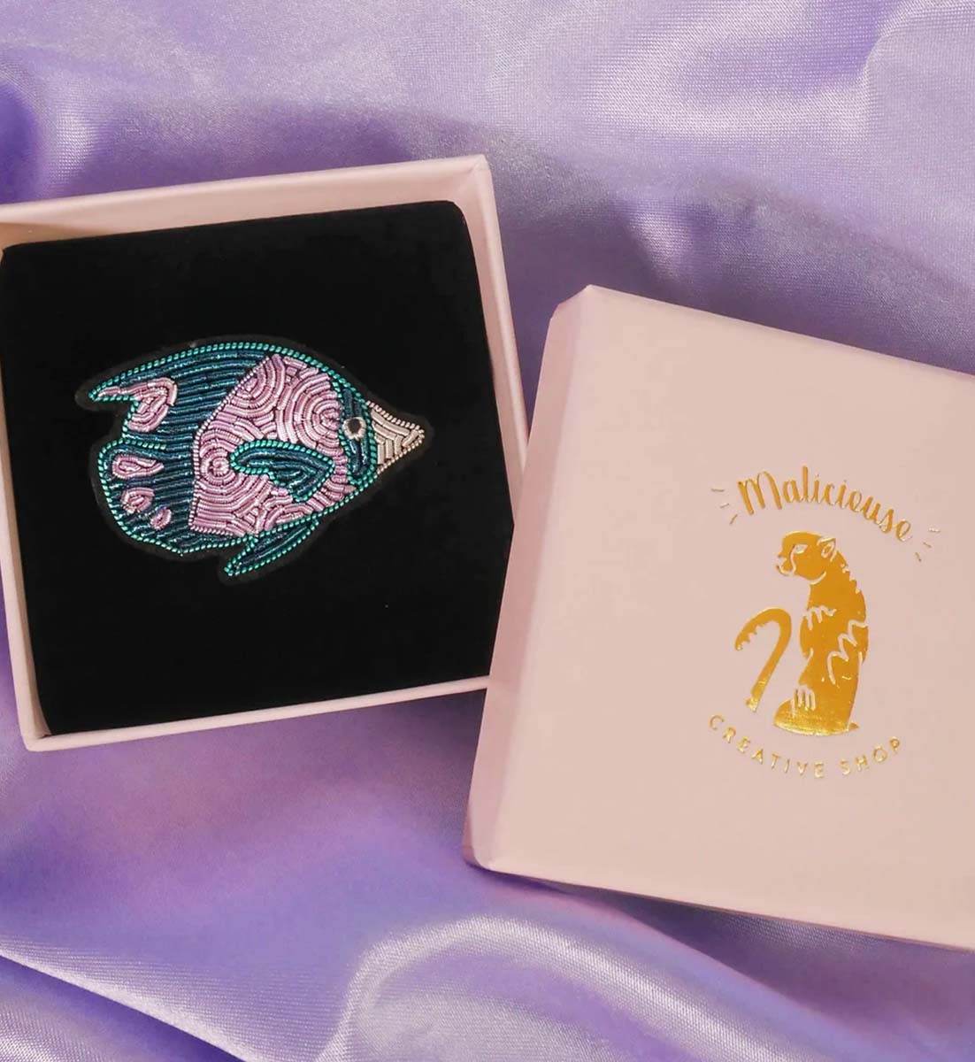 Eine wunderschöne Fisch-Brosche, komplett von Hand mit glänzendem Lurexgarn bestickt, perfekt für Liebhaber des Ozeans und der Meeresbewohner.
