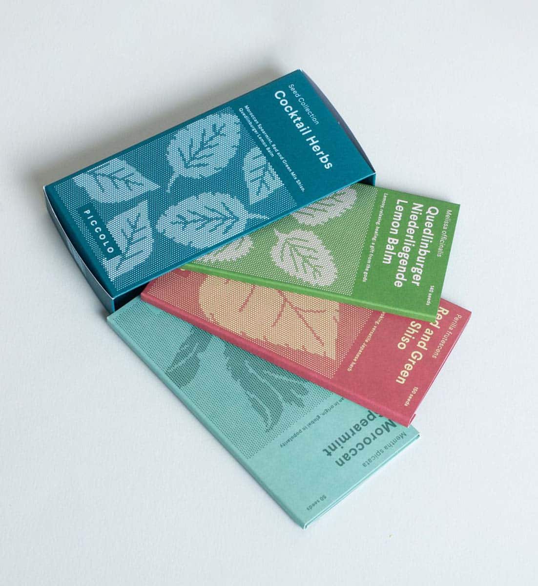 Die Cocktail-Herbs Kollektion aus der Piccolo Saatgut-Reihe beinhaltet drei diverse Kräutersorten. Marokkanische Minze, roter und grüner Shiso (Perilla) und Zitronenmelisse (Sorte: Quedlinburger Niederliegende). Die Kräuter wurden speziell für den Topfanbau entwickelt: kompakte Zwergsorten, die für Terrassengärten geeignet sind.