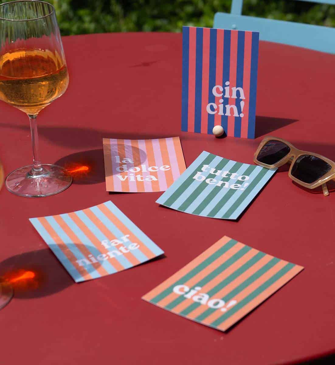 Italianità – nichts verbreitet mehr Vorfreude auf den Sommer als der italienische Lebensstil: Pizza, Pasta, Espresso, Spritz & Vino, Baci, Mare, Vespa & Fiat. Diese Karten holt dieses Flair aufs Papier und macht so richtig Lust auf Sommer, Meer & Sonnenschein.