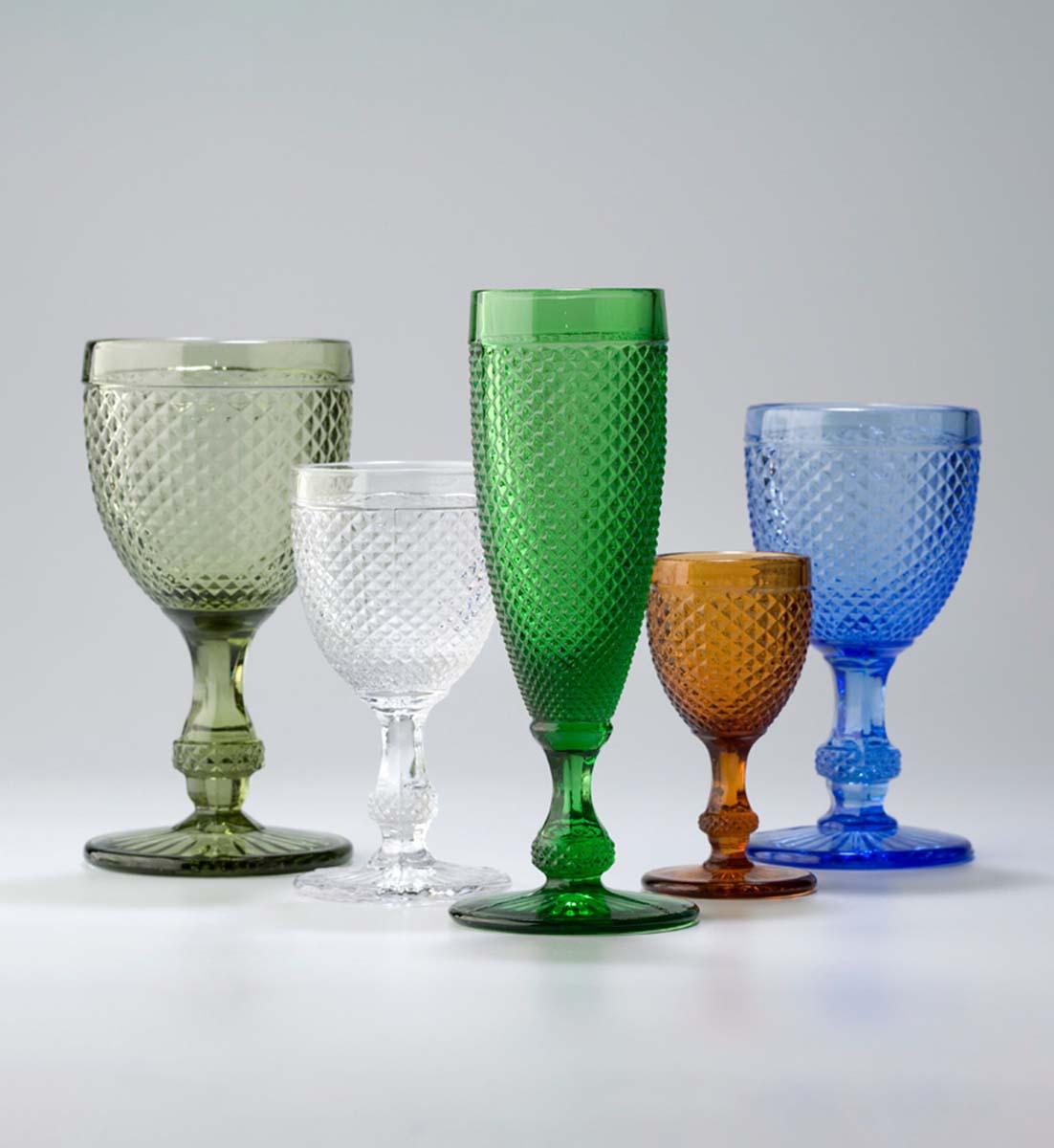 Wunderschöne Kelchgläser in verschiedenen Farben, um dem Tisch eine besondere Note zu verleihen.