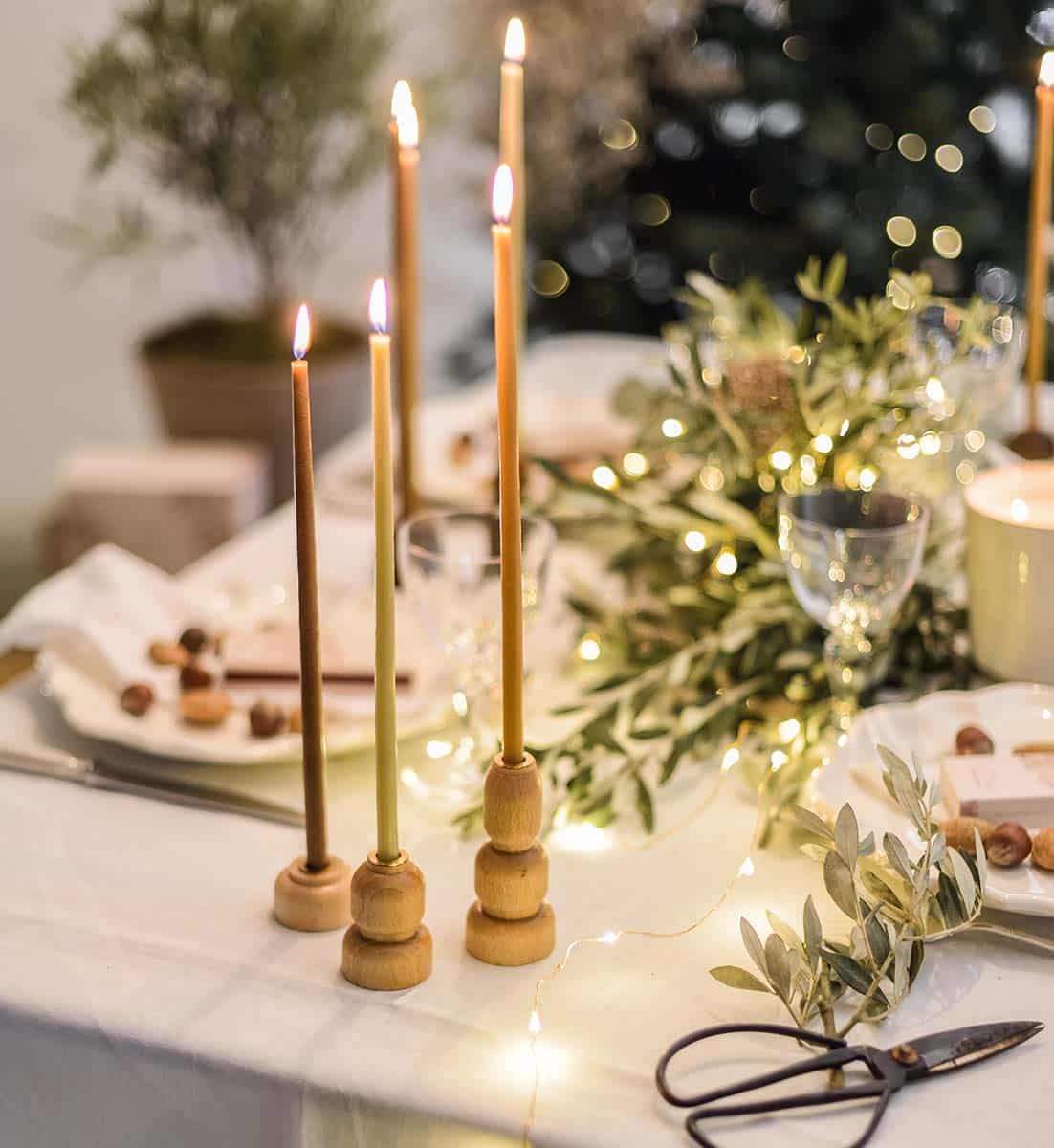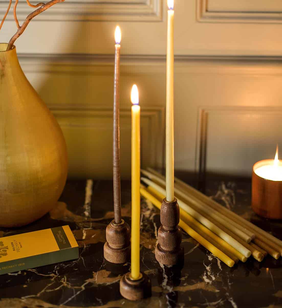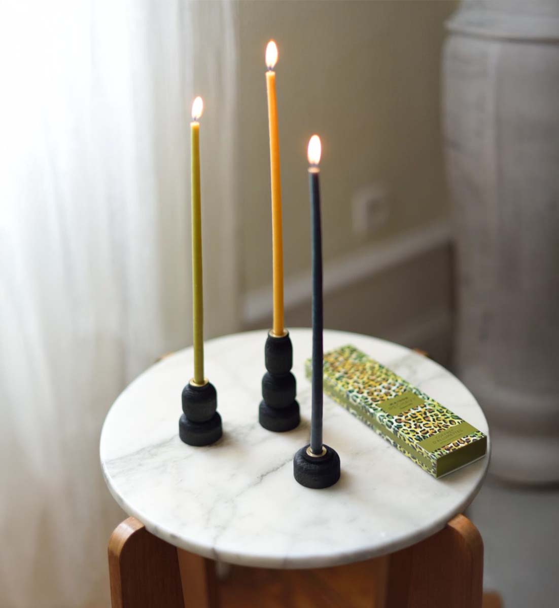 Kerzenhalter aus dunkler Holz und Messing mit runden und organischeren Linien.