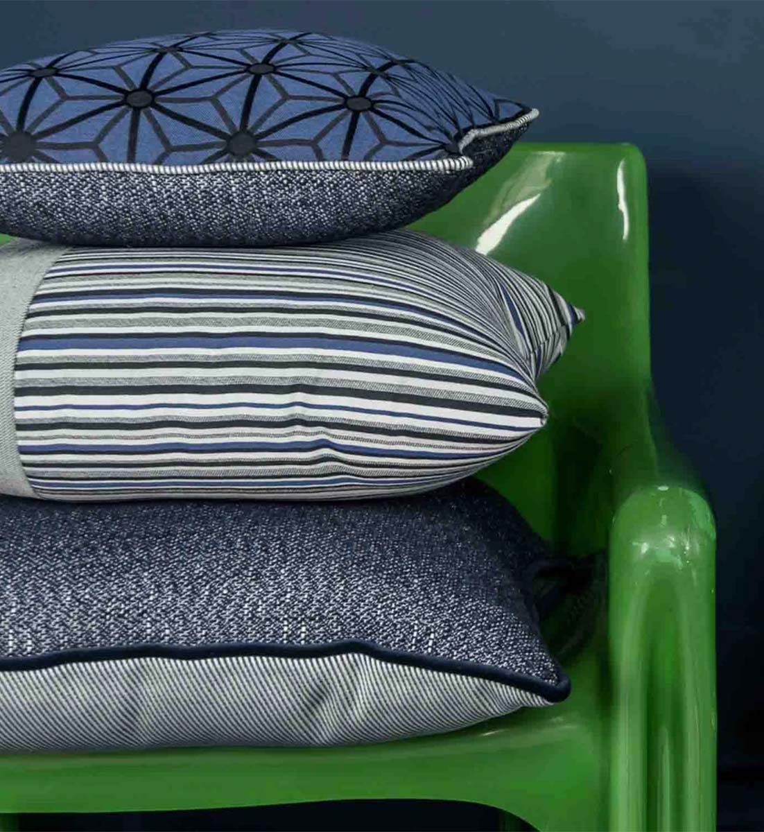 Quadratisches Kissen aus feinem blauen und schwarzen Jacquard-Stoff mit gemustertem und weicher Baumwollsamt-Paspelierung, ein raffinierter Akzent für jedes sommerliche Ambiente.