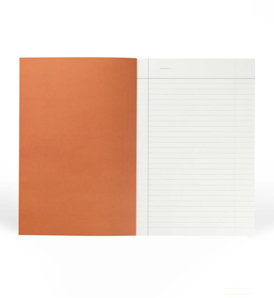 Die Seiten sind liniert mit Rand. Oben steht jeweils auf beiden Seiten «Subject». Die Buchhülle besteht aus ungestrichenes Papier, dadurch wirkt sie rauer und natürlicher.