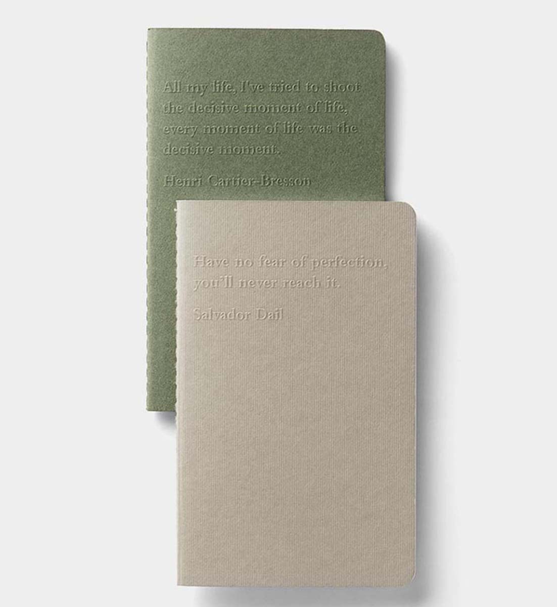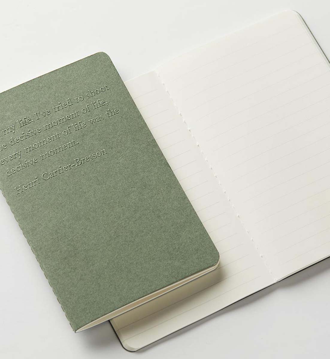 Set aus zwei Notizheften: 1x cremefarbiges liniertes Papier, 1x weisses blanko Papier mit Zitat