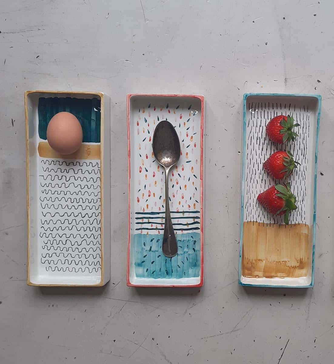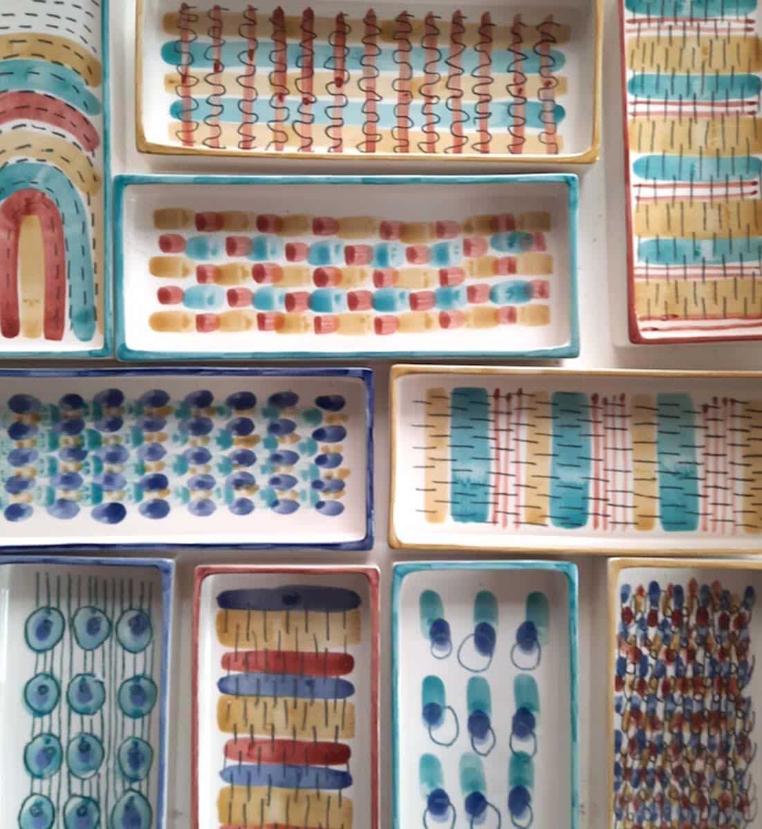 Rechteckiger Teller mit geometrischen Mustern bemalt. Dekoriert mit bleifreiem Oxid, kristallisiert und poliert.